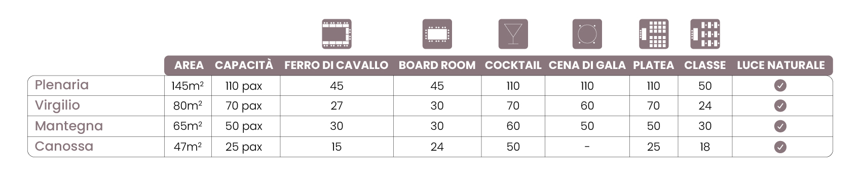 Virgilio dispone di 80 m² fino a 70 posti, con luce naturale e oscuramento motorizzato per gestione ottimale dello schermo. Inclusi sistema audio, videoproiettore, schermo motorizzato, lavagna a fogli e Wi-Fi. Kit relatori e carrello abiti completano la dotazione.